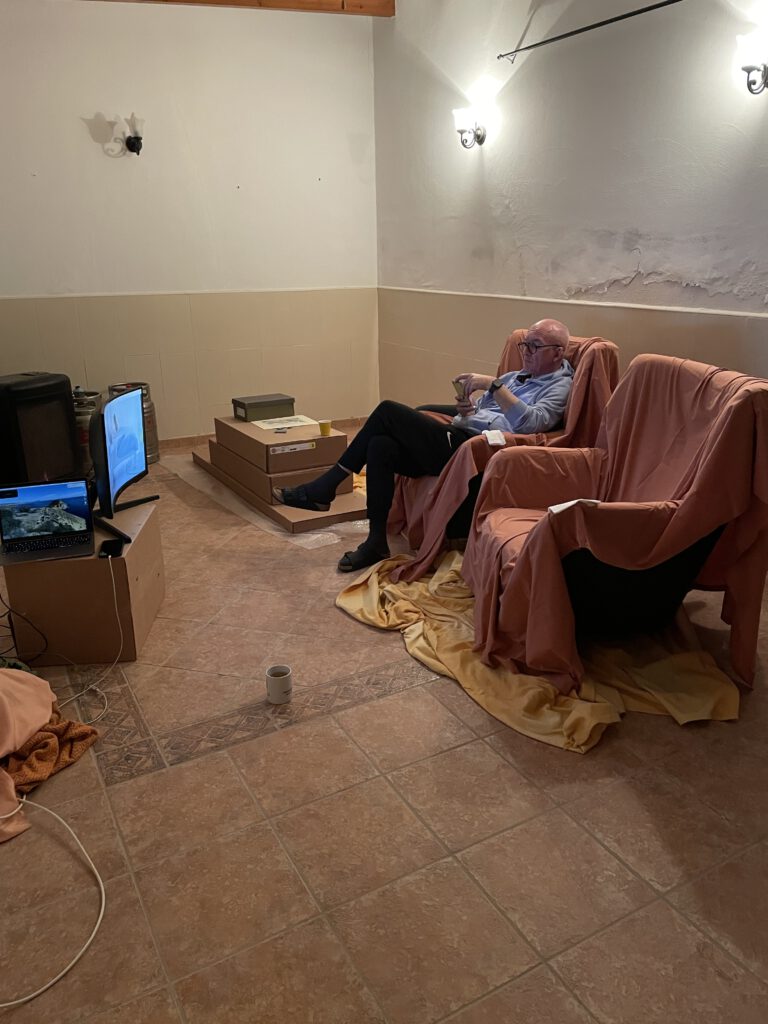 Toen waren we er ook wel klaar mee. Het huis was bijna leeg. Er stond nog een slaapbank, daar zijn we maar op gaan bivakkeren. Met de laptop op een tafeltje nog wat tv gekeken. En ons heerlijk gedoucht in de tijdelijke badkamer. We hebben een fijne douche, dat dan wel.