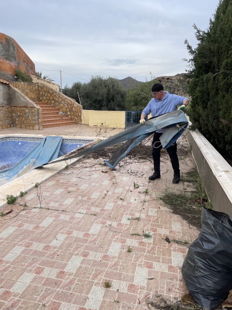 Gea was ondertussen begonnen met het opruimen van de zooi rond de buitenkeuken. Daar lag me toch een berg troep (wat we allemaal in die grijze containers op het kamp hebben gestort). Kees begon aan de plantenbakken aan het begin van de trap naar het zwembad: alle onkruid eruit. Er zitten nu enkel vetplanten en een enorme bolcactus in. Laten we mooi zitten zo. Ook meteen alle losse stenen opgeruimd en het onkruid tussen de tegens weggehaald. Gea is vervolgens de trap aan gaan vegen. En al doende kwamen we uit bij het zwembad.