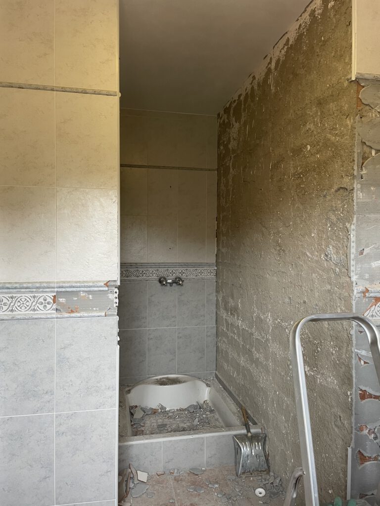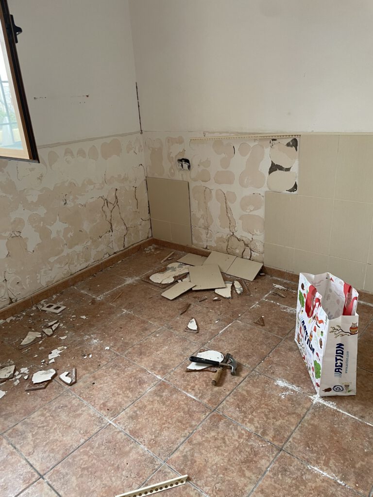 Terug in El Tarahal begin Gea met het verwijderen van de tegels, die als lambrisering aangebracht waren in de logeerkamer. We hebben één slaapkamer beneden zelf in gebruik, de slaapkamer boven is “onze slaapkamer” dus de derde slaapkamer is dan meteen de logeerkamer.