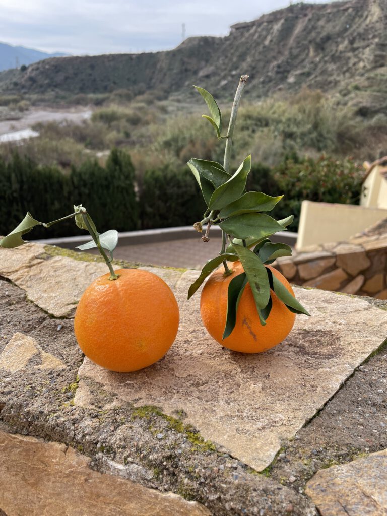 Tussendoor hadden we nog even pauze. Met een kop koffie/thee én een verse sinaasappel. Die hoef je hier niet te kopen, die pluk je gewoon uit de boom. Er staat er eentje in de tuin van de buurman, maar die is er nooit. Fijn dus!